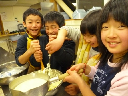 慣れない手つきを見かねて女の子の指導が入ります。「もっとちゃんと混ぜてー」やら「あー!勝手に味見したなぁ!」やら・・・。しかし、賑やかに作っていると主役にバレてしまうので、皆コソコソと小声で話していました。