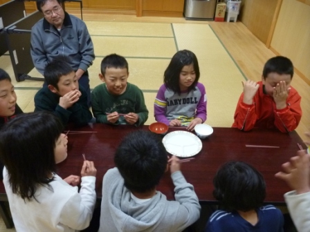 箸の使い方や行儀の悪い作法の話をしている時、今年もでました珍解答。「なみだ箸」ってどんな箸の使い方?とクイズを出したところ・・・「お味噌汁を飲む時、汁が目に入って、涙がでること!!」・・・大爆笑がおきました。去年、箸を頬にあて「涙」と真似た珍解答を上回るユニークな解答がでました。正しくは、「箸の先から料理の汁などを ポタポタ落とすこと」です。