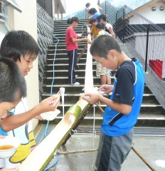 この日の夕食は、玄関前の階段を利用して、そうめん流しをしました。