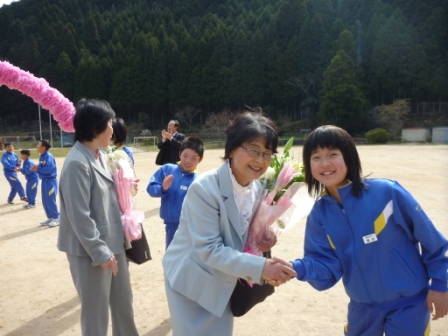 継続生は、離任される先生を見送りに一足早く登校しました。「去年、一年お世話になりました!」