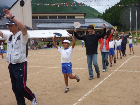そして、まずは徒競走。規模の大きい小学校では、流れ作業のように徒競走が行われていますが、越知谷小では、走る前に一人一人名前を呼ばれ、元気に「はいっ!」と返事します。