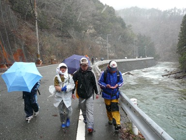 朝5時。小雨が降るまだ暗い中を、朝食のおにぎりを背負って出発です。