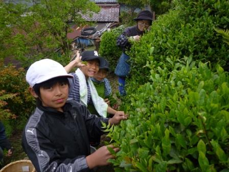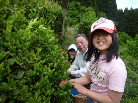 夏も近づく八十八夜~♪より大分遅い5月29日に、厨房職員の笹倉さん宅の茶畑でお茶摘みをさせてもらいました。このお茶は、1年間学園生が飲むお茶になります。今年は、寒さが続いたためか、新芽が出るのが遅れ、どこのお家も時期を遅らせて収穫していました。そんな忙しい時期に、地域の方3名に講師として来て頂き、お茶摘みからお茶揉みまで教わりました。