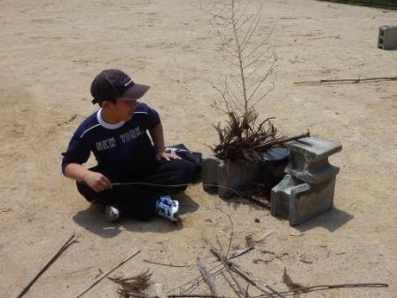 さて、いざ開始!となったものの、こちらで用意したのは、飯盒、お米、数本のマッチと数枚の新聞紙のみです。子ども達は、かまど作りや薪集めからのスタートです。