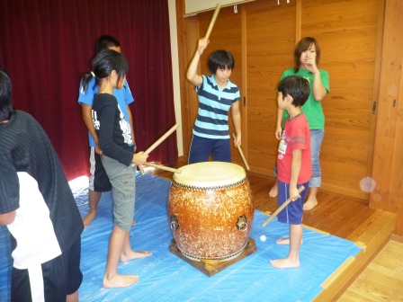 そして、今回の交流会の一番の目的、太鼓の合同練習を行いました。お互いに1曲ずつ披露すると、「すごい!」「うまい!」「音が揃ってる!」とべた褒めしてもらい、神河の学園生は、少し自信がついたようです。また、三瓶こだま学園の学園生の太鼓は、迫力があり、声もよくでており、神河の子どもたちは圧倒されていました。その後は、叩き方などを教えてもらい、一緒に練習しました。たった1泊2日でしたが、生活を共にするだけで、生活習慣や年上の役割、みんなで協力する姿など多くの刺激を受けた学園生たちでした。
