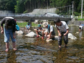 お昼ごはんは、地域の方が企画した、渓流そうめん流し。終わった後は、川を汚さないように、細かい麺の切れ端までがんばってきれいに取りました。