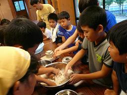 地域のお母さん方を講師に招き、地元でよく作られる「こんにゃく作り」にも挑戦しました。子どもたちは、どうやってこんにゃくを作るのか興味津々でした。