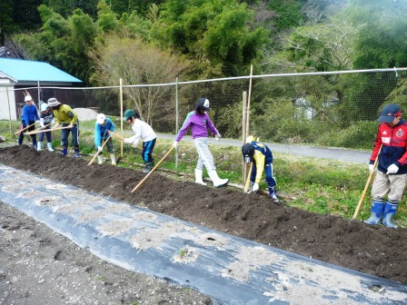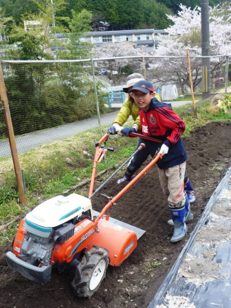 そして、6年生の特権ということで、耕運機の操作も行いました。小学生の力だけでは耕せなかった深い部分も耕運機のおかげでふかふかの土となりました。そして、農作業初日とは思えぬチームワークをみせてくれたので、種芋を植えはあっとい間に終わりました。