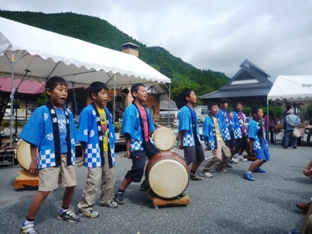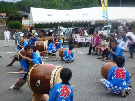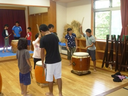 そして、今回の交流会の一番の目的、太鼓の合同練習を行いました。お互いに1曲ずつ披露すると、「すごい!」「うまい!」「音が揃ってる!」とべた褒めしてもらい、神河の学園生は、少し自信がついたようです。また、三瓶こだま学園の学園生の太鼓は、迫力があり、声もよくでており、神河の子どもたちは圧倒されていました。その後は、叩き方などを教えてもらい、一緒に練習しました。たった1泊2日でしたが、生活を共にするだけで、生活習慣や年上の役割、みんなで協力する姿など多くの刺激を受けた学園生たちでした。