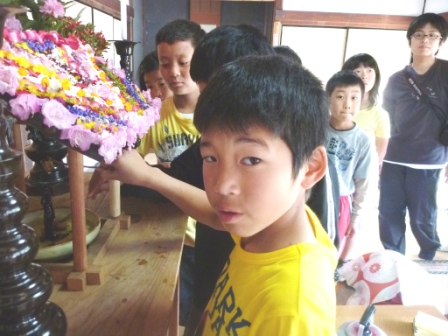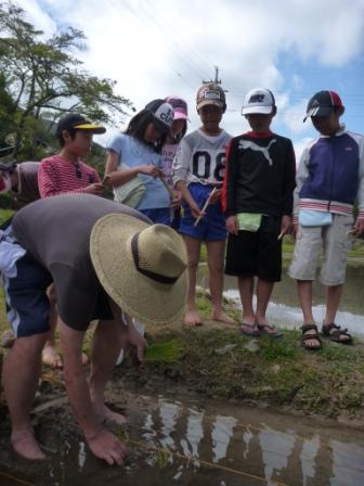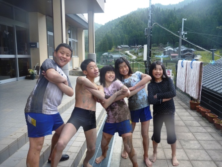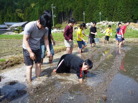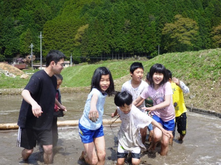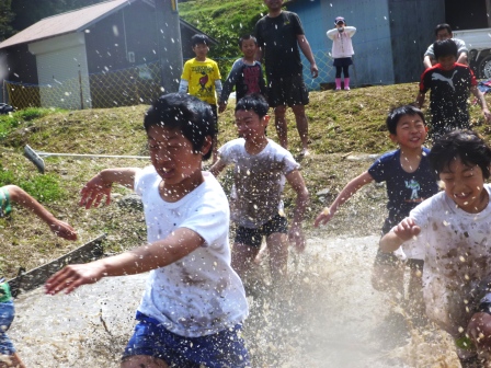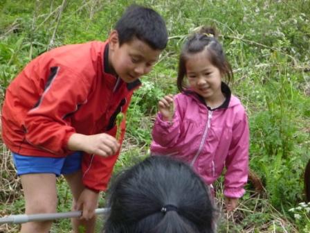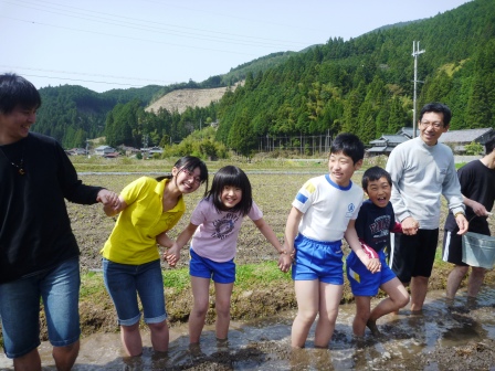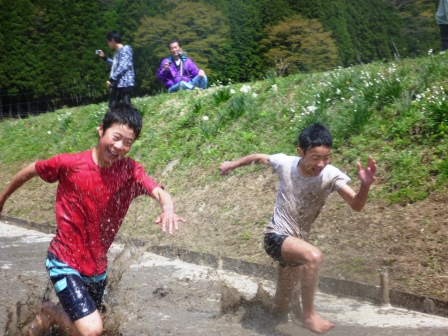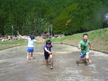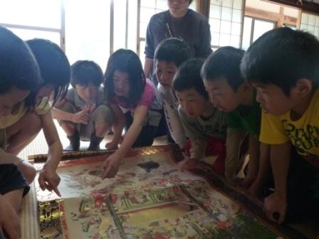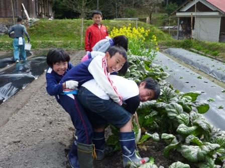 まずは、木箱の上で冬菜に塩を振り、ひたすらゴロゴロと転がしながら、塩もみしていきます。大きな冬菜をみんなの小さな手で揉むのは、なかなか時間が掛かる作業でした。