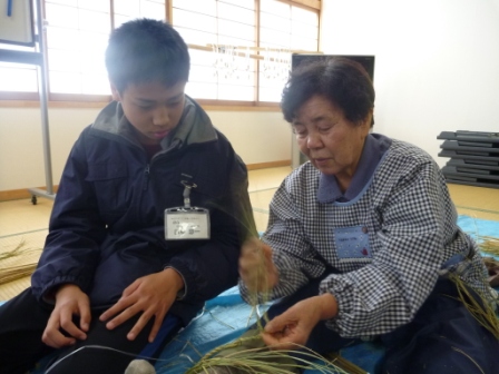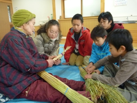 作畑でも有名な注連縄作りの名人、井上和子さんと井上まつゑさんに来ていただいて、正月飾りの作り方を教わりました。難しい「ごぼう締め」に挑戦する子も多く、悪戦苦闘していましたが、講師の方々は丁寧に教えてくださり全員立派なお土産ができました。