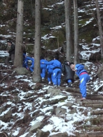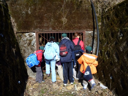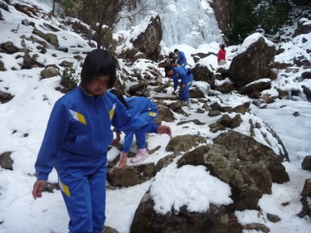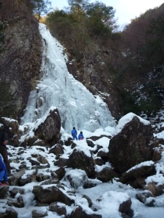 また、翌日には山道を登り、峠を越え、白口集落を過ぎ、白綾の滝まで歩きました。途中、銀山の坑道入り口に興味津々。白綾の滝は、ここ数日の冷え込みで、水が流れつつも凍っていました。