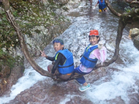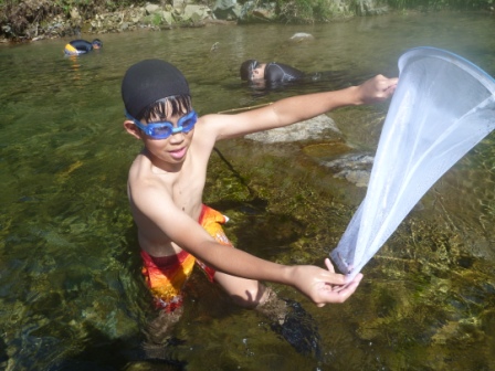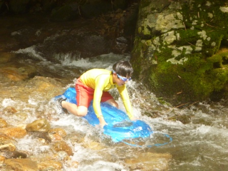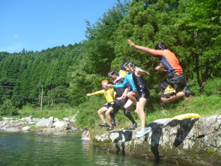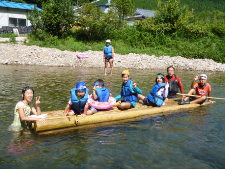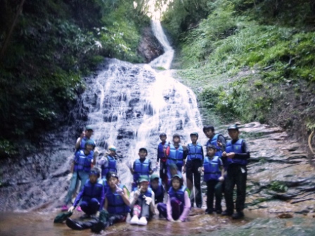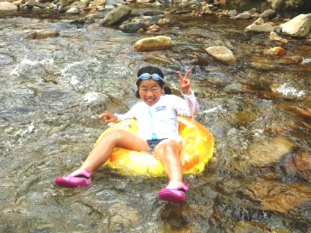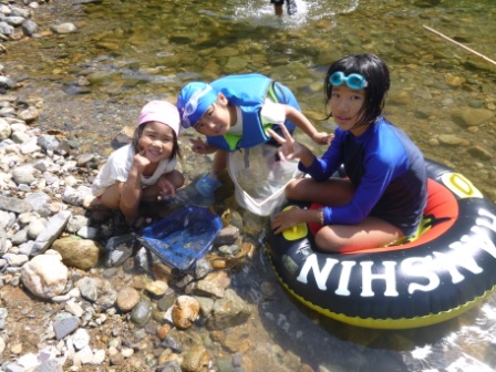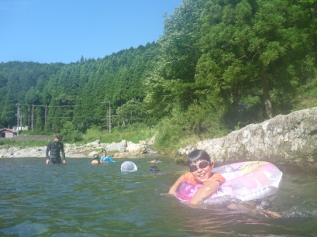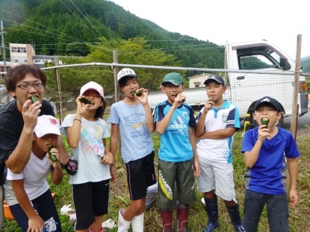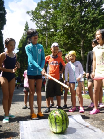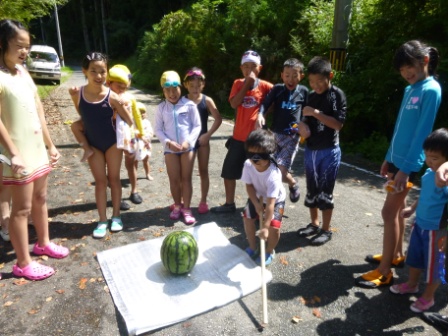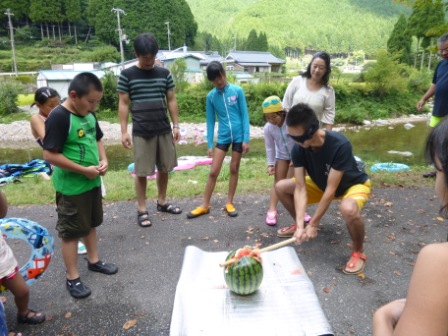 まず、地元の方6名と学園生、そして学園生家族を合わせ30名近くで、川遊びを楽しみ、また、みんなでスイカ割りもしました!