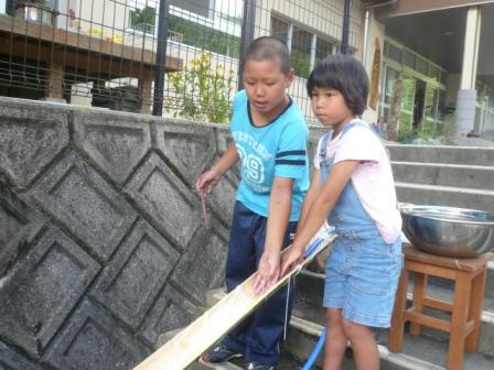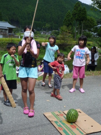 そして、おやつには、真夏の日差しをいっぱい浴びて、甘~くなったスイカでスイカ割りをしました。もちろんセンターで栽培したスイカです。
