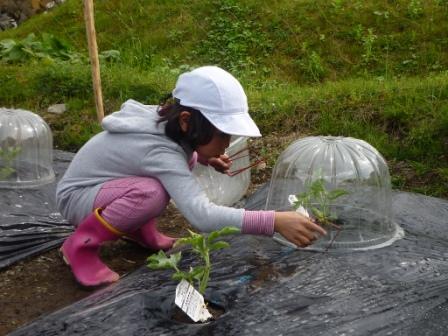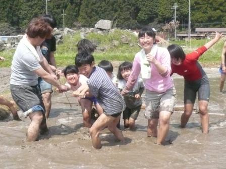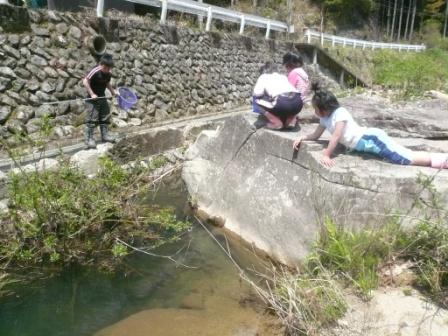 センターの前を流れる越知川は、千ヶ峰を源流とし、澄み切った綺麗な清流で知られています。そのため、川底を覗けば、キモツ(カワムツ)やゴトンボ(ハヤ)が、容易に見つけられます。そこで「釣竿じゃなくて、網で獲ってやるー!」なんて、意気込んで出かけていきましたが。結果は…キモツの稚魚ばかり。川魚だって、「早々簡単に捕まってたまるかー!」と思っていることでしょう。