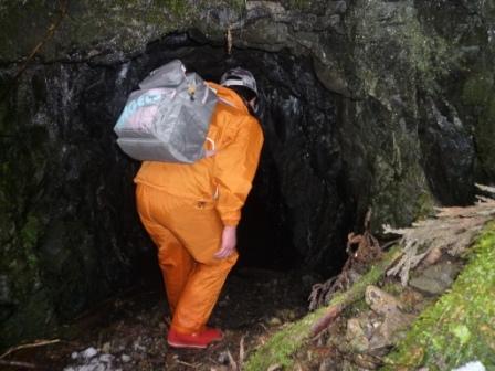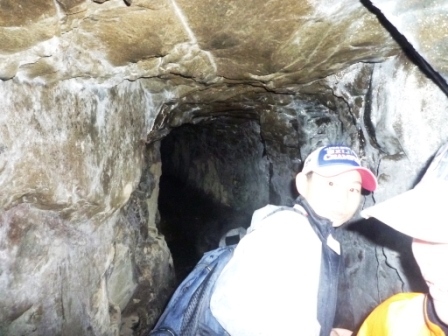 山道の途中で坑道の入り口を発見し、大興奮の子どもたち。