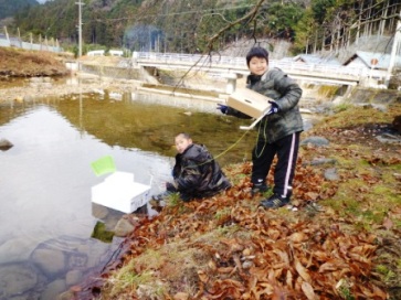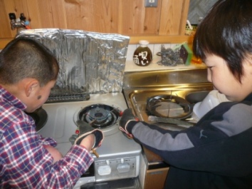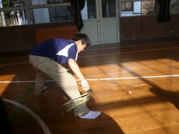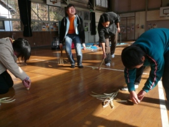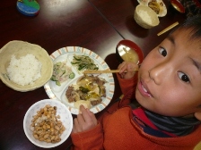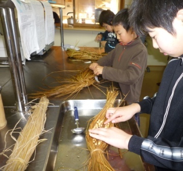秋に収穫した学園の大豆で、納豆を作ってみました。 8月の集中豪雨で大豆畑がプールのようになり、大きな被害を受けましたが、何とか去年の3分の1弱の収量がありました。納豆には、白大豆を使用しました。 青大豆は、味噌作りにする予定です。 藁苞(わらづと)作り。 藁も、子どもたちが育てた稲藁です。 蒸した大豆を包んでいるところ 藁の中にはもともと納豆菌がたくさん棲んでいるそうです。 湿度と適温を与えてやると、急激に繁殖。蒸した大豆に網の目のように菌糸がはっていっているのでしょうか。すごいですねえ。 おいしい・・・? うーん、糸の引き方がちょっとイマイチでした。