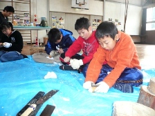 地域の方に、「昔遊んだ」と教えていただいた「ぶちゴマ」を、みんなで作りました。 丸木を鉛筆型に削ります。 今回の材木は杉・・・硬かったです。 表面にきれいに絵を描いて完成。 「ぶち」ゴマを「ぶつ」ムチは、ミツマタの枝の皮を剥いて作りました。 こうやって遊びます。↓ 大人でもはまります。