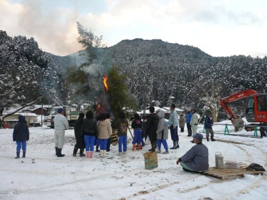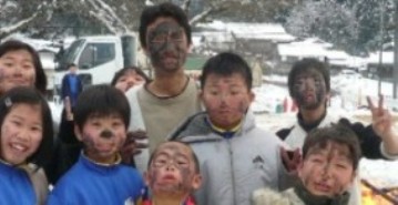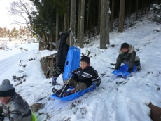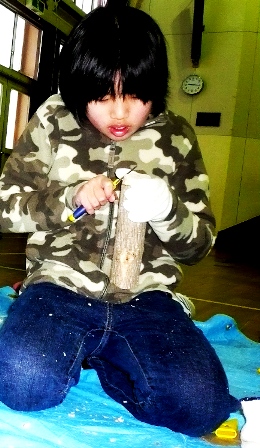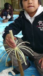 センターのグランドに生えているイチョウの木の枝でコマを削り、ミツマタの枝をムチに仕立てます。
