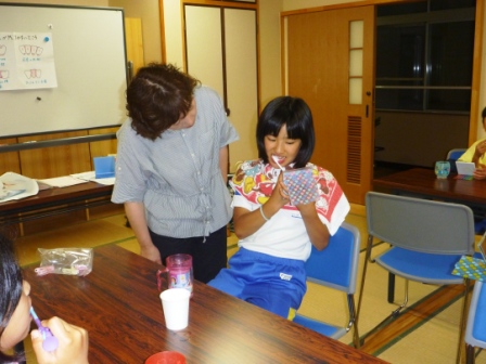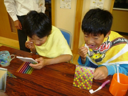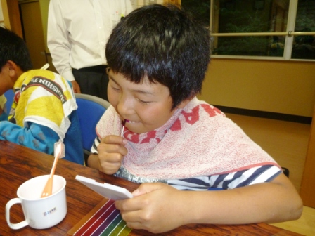 6月7日、町内の歯科衛生士さんが学園生の歯磨き講習のためにセンターまで来てくださいました。