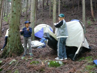 6/7(土)~8(日) 千ヶ峰~笠形山縦走&キャンプ!! ~目標を持って計画を練り上げた、レベル別の活動~ 6月第2週目の活動は、2年目6名、1年目6名に分かれての活動。1ヶ月前からそれぞれで集まり、やりたいこと、目標、行程などを入念に計画してきました。 1年目の子どもたちはキャンプを計画。少人数に分かれて火起こしに挑戦した前回とは違い、「皆で豪華な料理を作る」ことを目標に、チャレンジしました。 隣りの大畑集落から林道を登り、千ヶ峰稜線近くの南山大師堂前の杉林で幕営しました。 夕食メニューは、手打ちうどんとゼリーです。うどんは出発前にセンターで打ってからキャンプ地に向かいました。縦走中で疲れた継続生たちを出迎え、ふるまいました。仲良く、おなかいっぱい食べました。 朝食は手作りパンとホットケーキ。レーズン、チーズなど、思い思いの味付けで焼き上げました。 昼ごはんは、センターに戻り、かまどでご飯を炊きました。味噌汁、サラダを作って、いろりのまわりでいただきました。最後は五右衛門風呂でキャンプの汗と灰を洗い流し、活動終了です。 お母さんが用意してくださったこの日の夕食が、なんとありがたかったことでしょう。 ================================================ 2年目の継続生の活動は、「千ヶ峰‐笠形山縦走キャンプ」。2年目でしかできないハードなことをしよう!と意気込んで立てた計画でした。 1日では無理のある行程なので、途中テント泊をはさんでの山行です。 センター前の石風呂登山口から入山し、千ヶ峰を山頂。夕方、稜線から少し下りたところにある、大畑・南山の「お大師さん」へ。キャンプをしている1年目の子たちと合流しました。翌日は、さらに稜線に沿って南下。 午後6時過ぎ、ようやく笠形山頂上を越えて、下山しました。 「グリーンエコー笠形」の大浴場でゆっくり汗を流して帰ってきました。 キイチゴをむさぼる子どもたち 1年目、2年目のグループはお互いに切磋琢磨しつつも、キャンプ地では互いの活動をねぎらったり、思いやる行動が目立ったのが印象的でした。 センターに帰ってくると、どの子たちも、達成感と自信に満ちた顔をしていました。