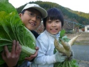 収穫した大根はたくあんにするために干す作業と塩漬け作業をしました。農家さんから白菜や人参カブをいただき「きりづけ」にして、夕食にいただきました。