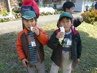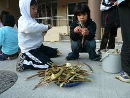 吊るし柿(干し柿)を作るために、センターのすぐ近くの家の「みの柿」(渋柿)を採らせていただきました。たくさんなっていましたが、鳥にあげる最後の1個を残して全部採り尽くしました。たくさん採った柿はセンターに持って帰り、皮をむき、吊るすために紐でくくる作業をしました。作った吊るし柿はお土産になりました。