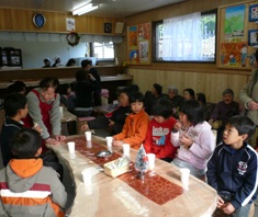 出来立てのお餅には採れたての大根をおろして「おろし餅」にしていただきました。みんなでお餅を食べていると、地域の方がその様子を見るために、だんだん集まってきました。帰りには葱や白菜、大根などの野菜をお土産にたくさんいただきました。
