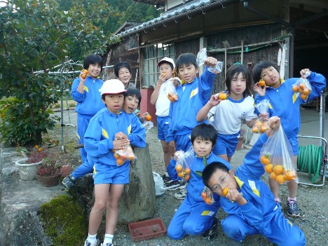 「つるし柿採って行ってか~?(=とっていかないか?)」