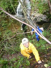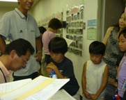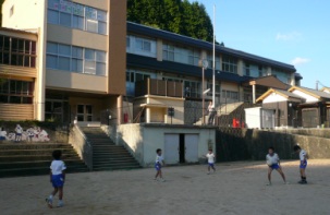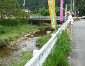 学園生の川遊びを見守るお年寄り。