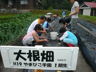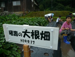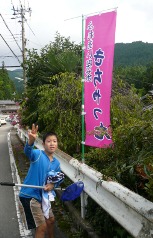 道端のきちゃったの幟(のぼり)と、学園生。