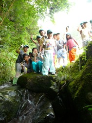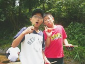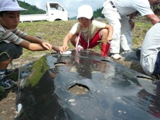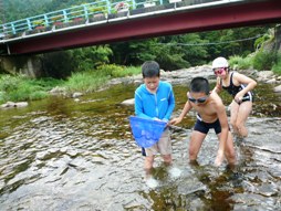 お昼ごはんは、地域の方が企画した、渓流そうめん流し。終わった後は、川を汚さないように、細かい麺の切れ端までがんばってきれいに取りました。