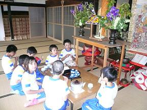 お寺の中には色とりどりの花で飾られた小さなお堂が設置されており、中央にお釈迦様の像が立たれています。そこにそっと、ひしゃくで“甘茶”をかけて礼拝します。普段は動物園のような騒ぎようの学園生たちも、さすがにこの時は厳粛な雰囲気に。砂糖を入れなくても甘い不思議な味の甘茶も飲ませていただき、貴重な経験を積ませて頂いた学園生たちでした。